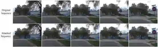 图4:停止标志图像的对于Faster RCNN的对抗样本可以跨视角进行泛化。第一行中的原始序列是为实际停止标志(stop sign)捕获的测试视频序列,并且在所有帧中都检测到停止标志。我们将我们的攻击应用到视频训练集以产生跨视角的对抗性干扰,并将该干扰应用于该测试序列以生成第二行中的攻击序列。这是一个数字攻击,停止标志要么没有被检测到,要么被检测为风筝。