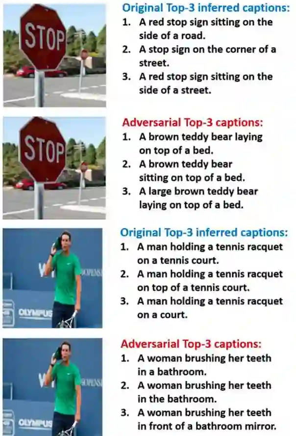 前不久,来自麻省理工学院、加州大学戴维斯分校、IBM Research 和腾讯 AI Lab 的学者撰写的论文将对抗样本攻击延伸到了图像标注(image captioning)系统领域(Show-and-Fool: Crafting Adversarial Examples for Neural ImageCaptioning)。image captioning可以从给定的图像中自动生成一段描述性文字,从而可以帮助盲人阅读新闻图片的含义,或者通过实时摄像头告诉他前方有发生了什么。而对图像标注系统使用对抗样本改造后,可能会生成无关、完全相反甚至恶意的描述。比如下图中中 Show-and-Tell 模型将一个关于纳达尔的对抗样本标注为了「一名女子正在浴室里刷牙。」;右图中 Show-and-Tell 模型将一个关于停车标志的对抗样本标注为了「一只棕色的泰迪熊躺在床上。」
