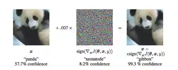 在给大家详细科普一下什么是对抗样本,在Ian J. Goodfellow的论文“Explaining and Harnessing Adversarial Examples ”中有这么一个例子:左边是一只大熊猫的图片,我们这张图片中加入一个很小的干扰噪声,虽然生成的图片看起来和原始的每什么区别,但是却会导致系统将其误认为是长臂猿的照片。