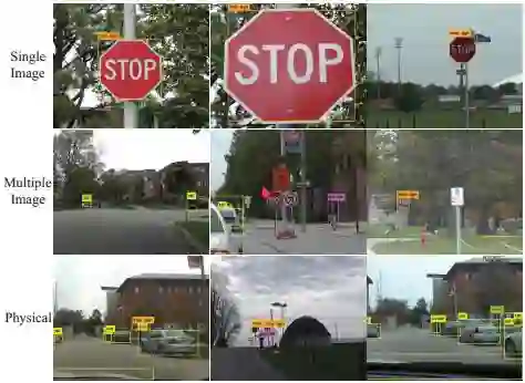 图8:我们测试是否Faster RCNN产生的对抗样本可以推广到YOLO。在第一行,针对小扰动的单个图像生成了这些对抗样本。YOLO可以毫不费力地检测到这些停止标志。在第二行,这些对抗样本是从多重图像生成的,数字干扰的图像可以在大约一半的时间欺骗YOLO。在最后一行,物理对抗性的停止标志在某些情况下还可以欺骗YOLO。详细的总结可在表1和表3中找到。