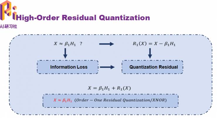 如图左所示是原来二值化方法的信息损失,我们定义量化残差的概念来描述信息损失: