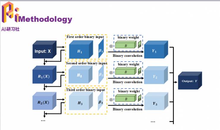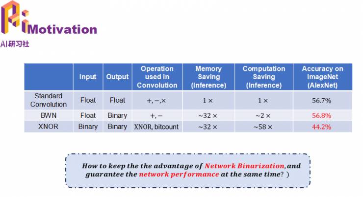 接下来介绍这篇文章的motivation,之前的XNOR网络虽然能实现58倍的加速,但网络精度出现大幅下降。我们希望既能利用二值化带来的便利,也避免网络精度的大幅度下降。