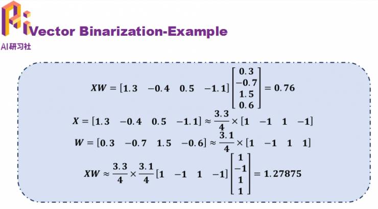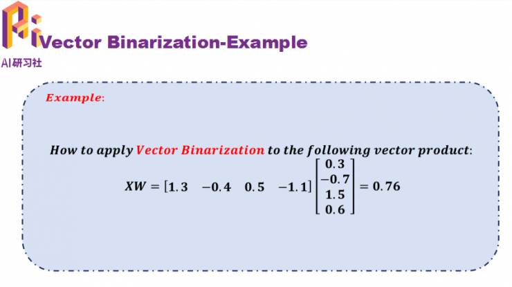 下面举个例子,如何运用向量二值化来二值化向量的內积。如下是四维向量相乘的例子: