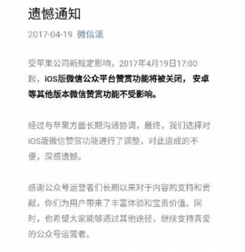 其实关于30%打赏费用的抽成问题,已经在今年年初的时候就引起很大争议了,当时苹果第一个点名的就是腾讯旗下的微信,微信也曾经与苹果进行了几轮对撕,也导致了微信的打赏支付方式一直没有在iOS版本上线,而Android版本是保持了该功能的。目前国内开发者,包括知乎、映客、陌陌、今日头条、 微博问答等等都修改了支付打赏的方式。