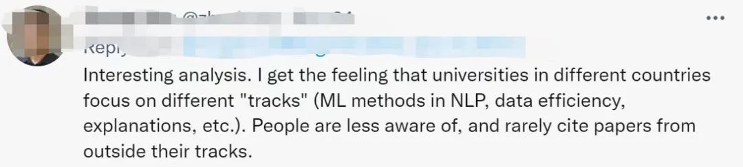 不过也有网友认为:来自不同国家的机构可能会侧重于不同的领域(例如 NLP 中的 ML 方法、数据效率等)。他们很少引用他们领域之外的论文。
