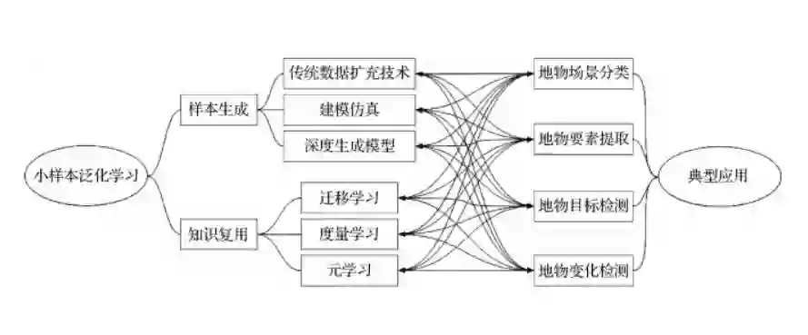 现有的解决思路可以归为两大类:一类是结合遥感图像特性进行样本智能化扩充,从而满足模型训练时的数据量需求;另一类则是从知识复用的角度出发,按照迁移学习、元学习和度量学习等策略引入先验知识,辅助在新地物类别上的学习,从而实现降低算法对遥感样本数据量需求的目的,完成小样本遥感智能解译。