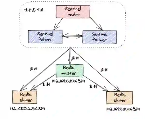 Sentinel节点信息交换:每隔2秒,每个Sentinel节点,会向Redis数据节点的__sentinel__:hello频道上,发送自身的信息,以及对主节点的判断信息。这样,Sentinel节点之间就可以交换信息
