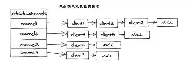 其中,字典的键为正在被订阅的频道, 而字典的值则是一个链表, 链表中保存了所有订阅这个频道的客户端。
