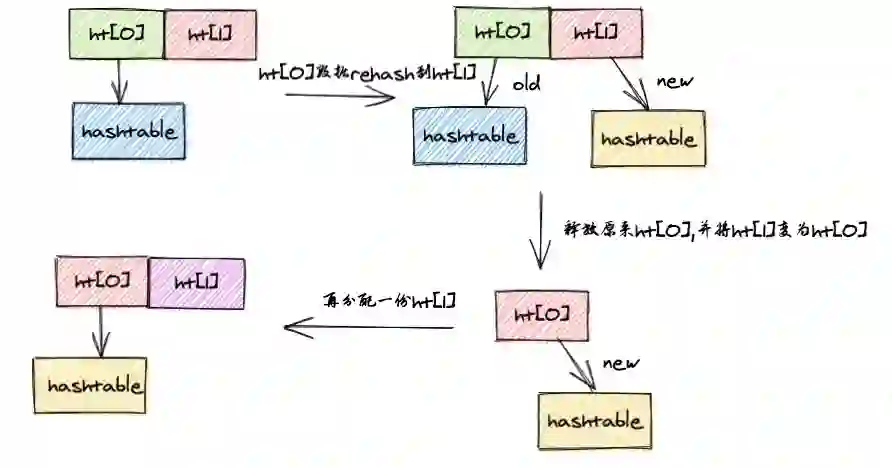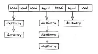 /* * 字典 */typedef struct dictEntry { // 键 void *key; // 值 union { // 指向具体redisObject void *val; // uint64_t u64; int64_t s64; } v; // 指向下个哈希表节点,形成链表 struct dictEntry *next;} dictEntry;