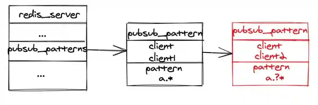 struct redisServer { // ... list *pubsub_patterns; // ...};// 链表中的每一个节点结构如下,保存着客户端与模式信息typedef struct pubsubPattern { redisClient *client; robj *pattern;} pubsubPattern;
