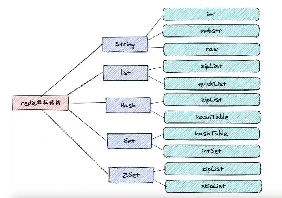 好了,通过redisObject就可以具体指向redis数据类型了,总结一下每种数据类型都使用了哪些数据结构,如下图所示