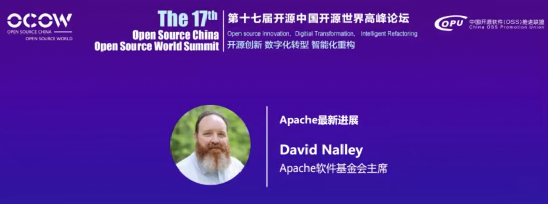 2022 年 7 月 21 日,由中国开源软件推进联盟主办,赛迪传媒、《软件和集成电路》杂志社联合承办,CSDN 独家直播的“第十七届开源中国开源世界高峰论坛”上,Apache 软件基金会总裁 David Nalley 带来了《Apache 最新进展》的主题演讲,为我们揭晓了答案。