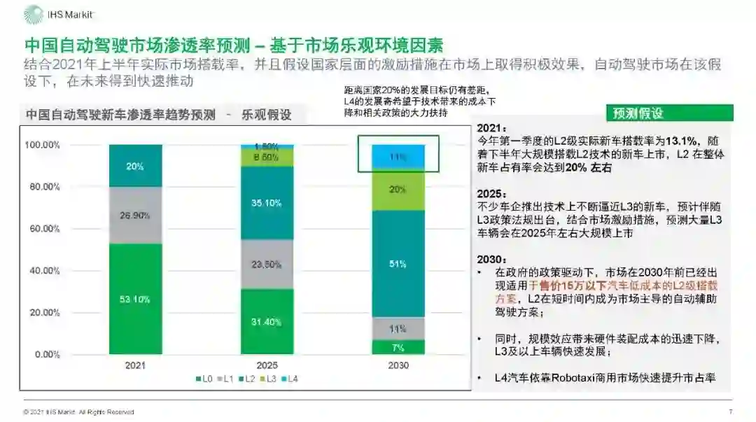 根据报告,当前我国乘用车市场进入平稳发展阶段,以自动驾驶技术为主导的新兴技术成为热门竞争战场,2021年,市场新车主要搭载L0/L1/L2技术,截止至年底L2技术搭载率在20%左右;在政策的驱动下,L2技术将在短时间内成为自动辅助驾驶的主导技术,预计在2030年搭载率在50%左右。