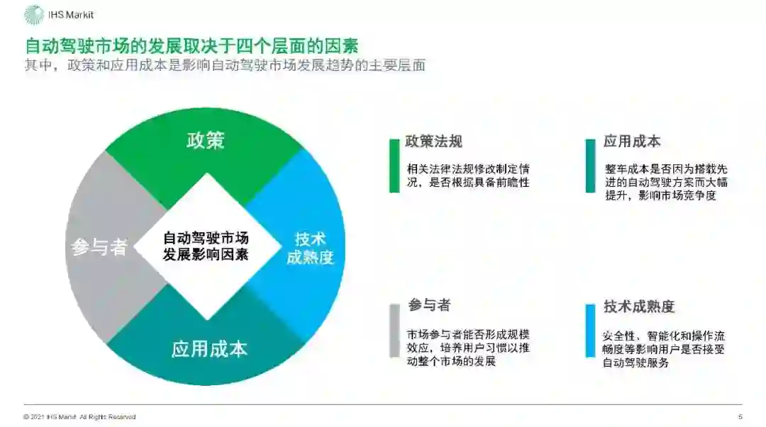 自动驾驶市场的发展取决于四个层面的因素。其中,政策和应用成本是影响自动驾驶市场发展趋势的主要层面。