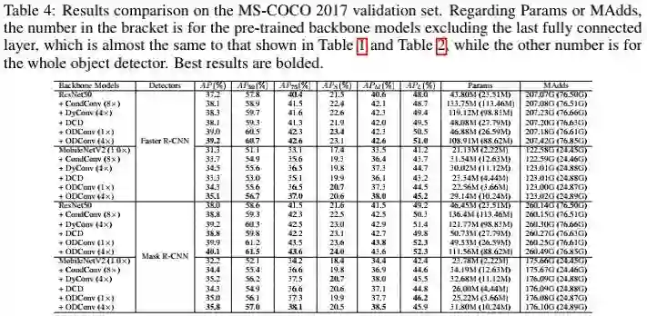 上表给出了COCO检测任务上的性能对比,从中可以看到:ODConv再次取得了比其他动态卷积更优的性能。