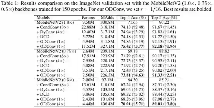 原则上来讲,这四种类型的注意力是互补的,通过渐进式对卷积 沿位置、通道、滤波器以及核等维度乘以不同的注意力将使得卷积操作对于输入存在各个维度的差异性,提供更好的性能以捕获丰富上下文信息。因此,ODCOnv可以大幅提升卷积的特征提取能力;更重要的是,采用更少卷积核的ODConv可以取得与CondConv、DyConv相当甚至更优的性能。
