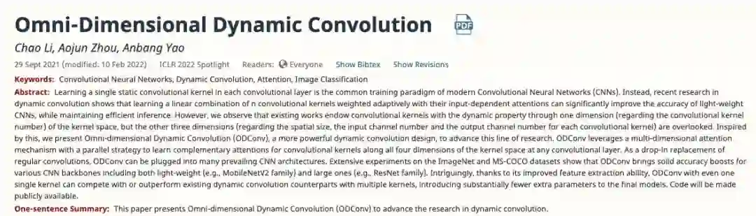 ICLR2022前段时间已经放榜,涌现了大量优秀的工作。笔者在浏览时偶然发现一篇关于动态卷积的文章ODConv(Omni-dimensional Dynamic Convolution, ODConv),Intel实验室姚安邦:https://yaoanbang.github.io/团队的工作。作为一种“即插即用”的操作,还是非常值得一读的,故做记录以飨各位。