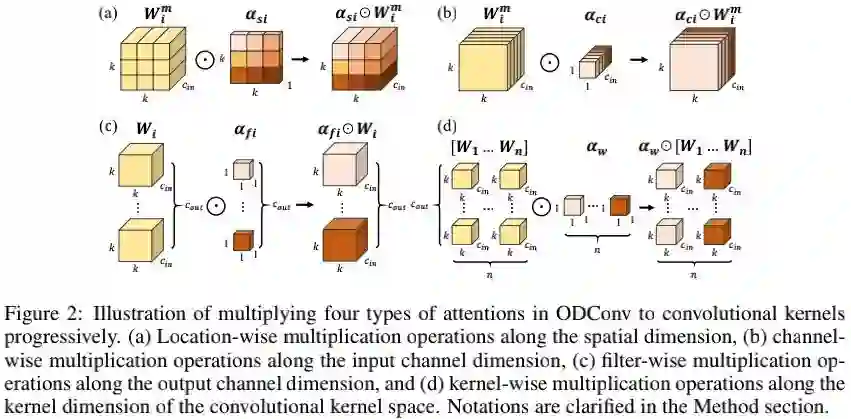 在ODConv中,对于卷积核 , 对 空域位置上的卷积参数赋予不用的注意力值,见上图a; 对不同输入通道的卷积滤波器赋予不同的注意力值,见上图b; 对不同输出通道的卷积滤波器赋予不同的注意力值,见上图c;而 则对n个整体卷积核赋予不同的值,见上图d。