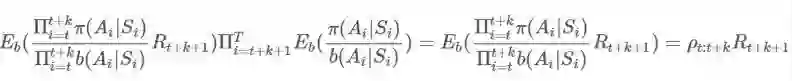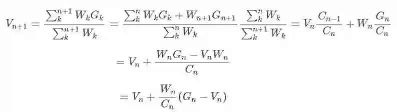 这被称为加权重要度采样(weighted importance sampling)。这是一种有偏差估计(其偏差会渐渐向 0 趋近),但方差更小。在此之前,人们可以为普通估计器提出糟糕的无界方差(unbounded variance),但这里的每一项的最大权重都为 1,这限制了方差的上界。Sutton 建议说,在实践中,总是使用加权的重要度采样。
