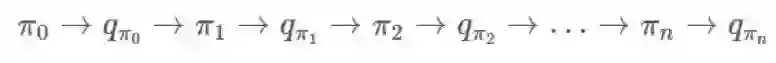 回想一下来自马尔可夫决策过程的策略迭代。这种情况没有太大的差别。我们仍然固定我们的 π,寻找,然后寻找一个新的 π′ 再继续。大致过程就像这样: