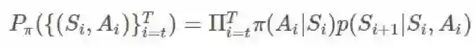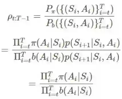 这差不多就是重要度采样比(importance-sampling ratio)的意思了。给定一个轨迹,这个确切轨迹在给定策略 π 时的概率为: