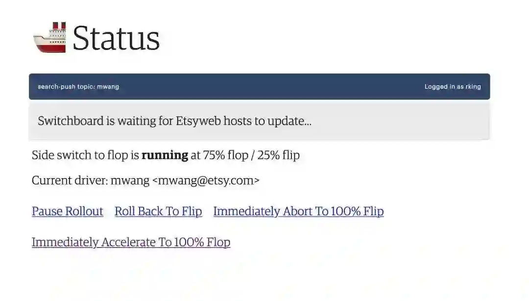 推动部署的工程师通过显示当前滚动发布状态的用户界面来管理 Switchboard,它还可以选择暂停或者回滚部署。