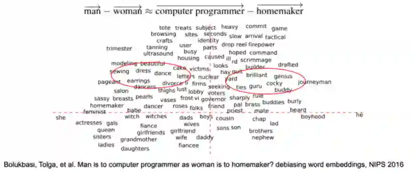 来自 NIPS 2016 的一篇文章发现,从谷歌新闻等比较正式的文体中训练出的词向量,带有非常强烈、令人不安的性别刻板印象。这体现在,语料中男性和女性的差异,相当于程序员和家政工人之间差异。