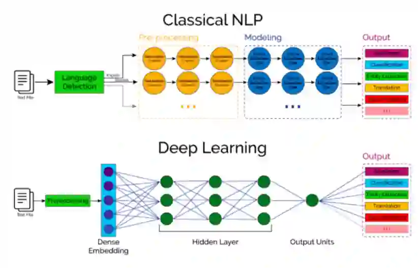 NLP 任务的解决从早期的依赖于规则性知识,到 2000 年初开始转向使用统计的方法,再到 2014 ~ 2015 年之后,接过深度学习视觉任务全面开花的接力棒,其“舞台中心”让位给了基于深度学习的方法。受深度学习的影响,一系列 NLP 任务从数据的处理和计算方法和计算能力都发生了非常大的变化。NLP 本身也引发了越来越多人的关注,加入到这个研究领域的人数开始指数级增加。