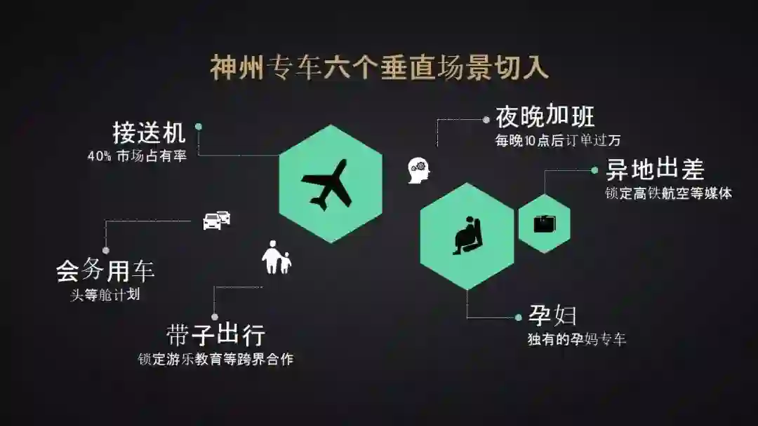 后面又延展出异地出差、会务用车、夜晚加班、孕妈专车、亲子出行等场景。