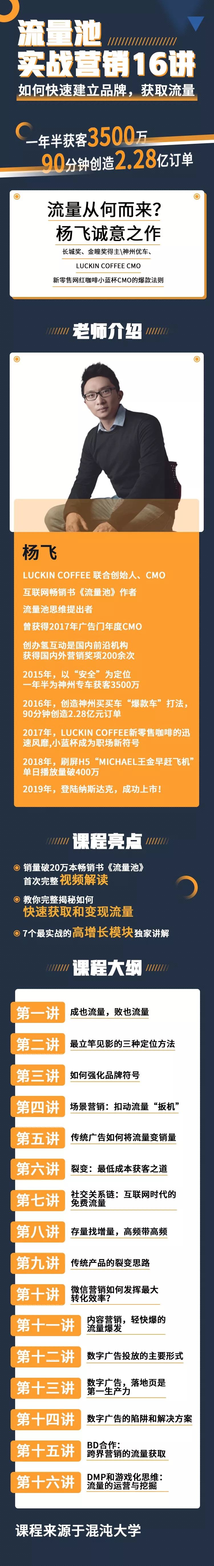 过去杨飞老师只在北京大学MBA总裁班上授课,今天他把北大课堂上的内容搬到了线上,结合多年实战经验,众多成功案例,开发了这堂视频大课——《流量池实战营销16讲——如何快速建立品牌,获取流量》。