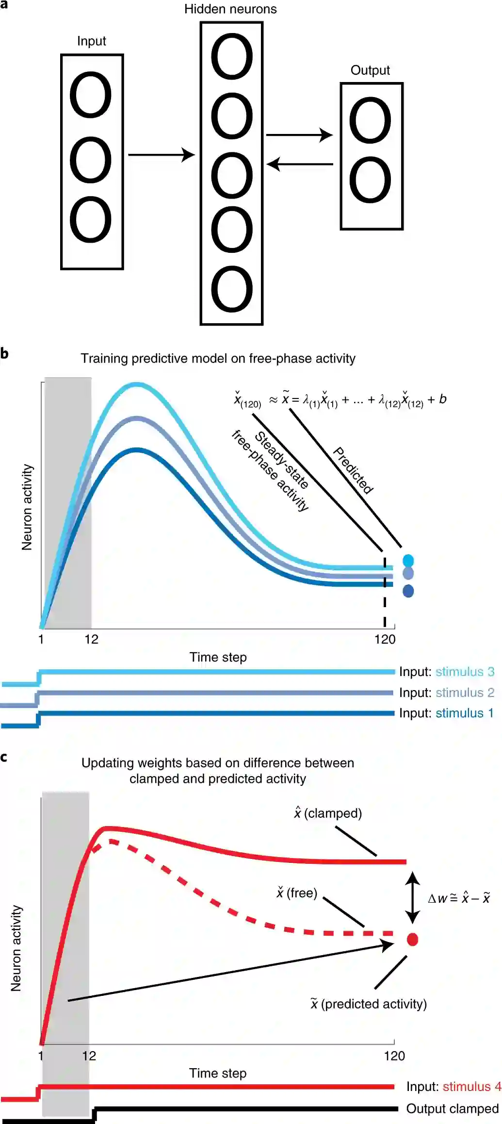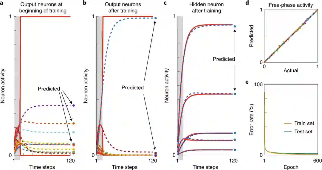 这里的新见解是,最初的自下而上活动足以让神经元预测自由相活动的稳态部分,然后可以将预测的自由相和钳制相(clamped phase)之间的不匹配用作教学信号。