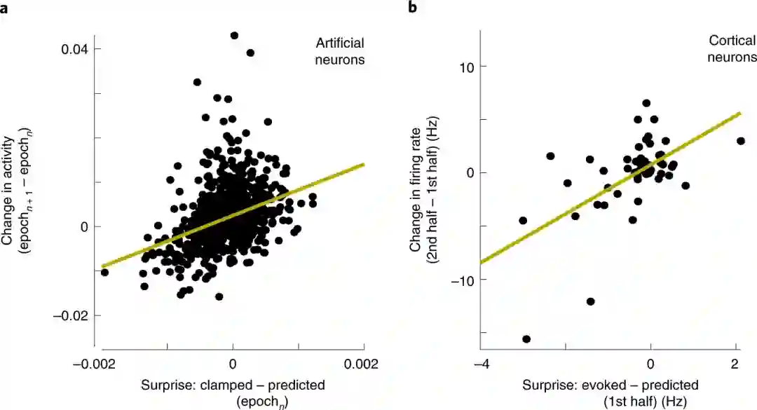 有趣的是,研究人员提出的预测学习规则也可以通过修改时间差异学习算法来获得,使其在生物学上更合理。时间差异学习是关于如何在大脑中实现类似反向传播的算法的最有希望的想法之一。它基于使用神经元活动的差异来近似自上而下的误差信号。这种算法的一个典型例子是对比赫布(Hebbian)学习,它被证明在某些假设下等同于反向传播。