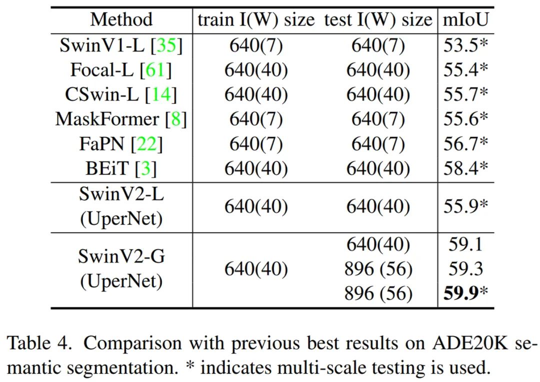 ADE20K 语义分割结果:下表 4 将 SwinV2-G 模型与之前在 ADE20K 语义分割基准上的 SOTA 结果进行了比较。Swin-V2-G 在 ADE20K val 集上实现了 59.9 mIoU,比之前的 SOTA 结果(BEiT)58.4 高了 1.5。这表明扩展视觉模型有益于像素级视觉识别任务。在测试时使用更大的窗口大小还可以带来 +0.2 的增益,这可能归功于有效的 Log-spaced CPB 方法。