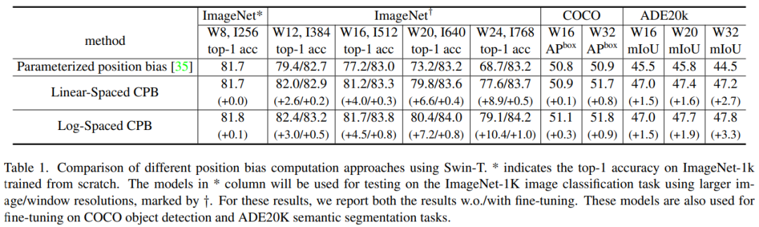 。如下表 1 第一行所示,当我们通过双三次插值方法,在更大的图像分辨率和窗口大小直接测试预训练 ImageNet-1K 模型(分辨率 256 × 256,窗口大小 8 × 8)的准确率时,发现准确率显著下降。这可能值得去重新检查原始 Swin Transformer 中的相对位置偏差方法。