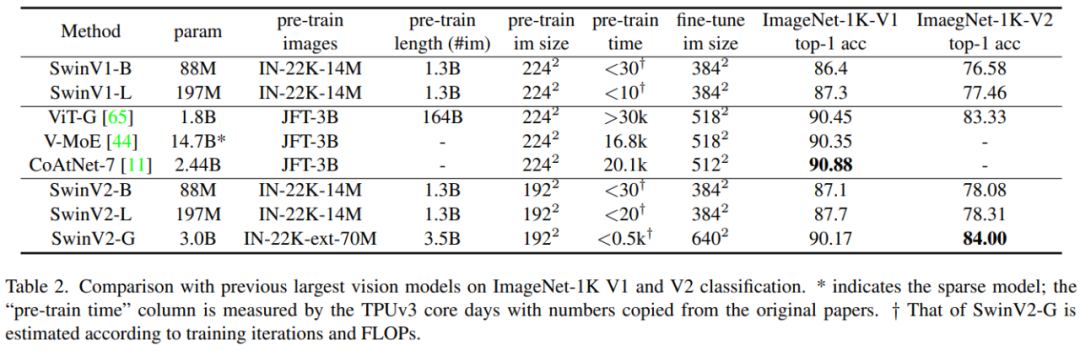 ImageNet-1K 图像分类结果:表 2 将 SwinV2-G 模型与之前在 ImageNet-1K V1 和 V2 分类任务上的最大 / 最佳视觉模型进行了比较。SwinV2-G 是之前所有密集(dense)视觉模型中最大的。它在 ImageNet V2 基准测试中达到了 84.0% 的 top-1 准确率,比之前最好的 ViT-G (83.3%) 高 0.7%。但是,SwinV2-G 在 ImageNet-1K V1 上的准确率比 CoAtNet-7 略低(90.17% 比 90.88%)。