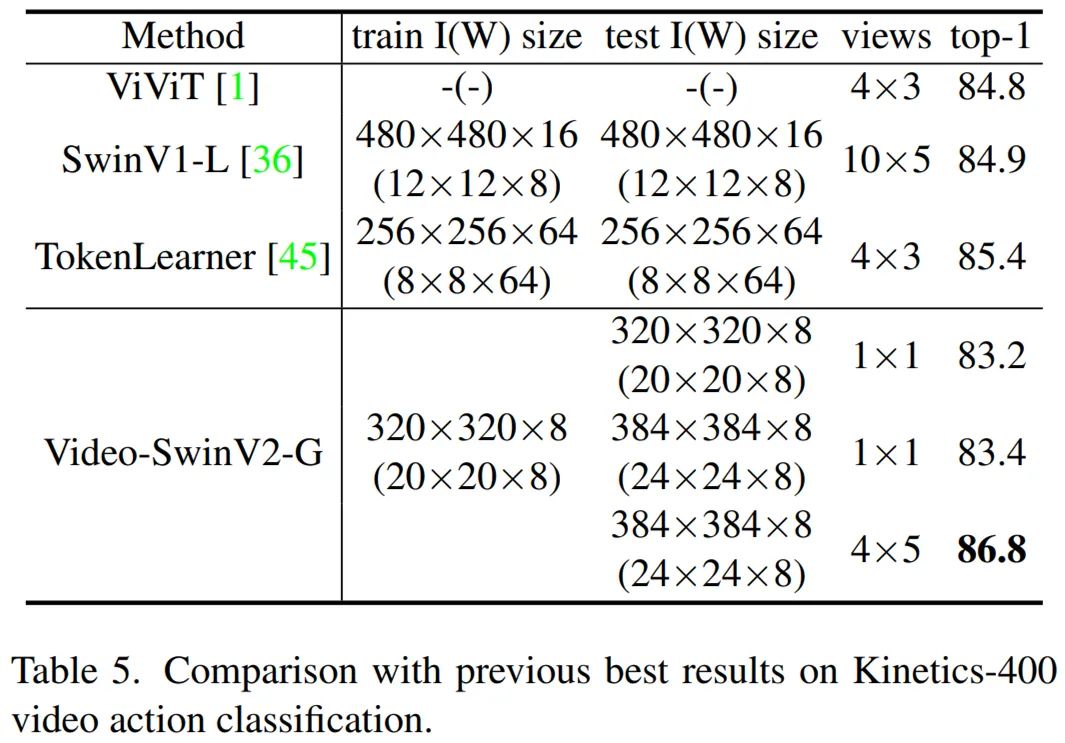 Kinetics-400 视频动作分类结果:下表 5 将 SwinV2-G 模型与之前在 Kinetics-400 动作分类基准上的 SOTA 结果进行了比较。可以看到,Video-SwinV2-G 实现了 86.8% 的 top-1 准确率,比之前的 SOTA (TokenLearner)85.4% 高出 +1.4%。这表明扩展视觉模型也有益于视频识别任务。在这种场景下,在测试时使用更大的窗口大小也可以带来额外增益 ( +0.2% ),这也要归功于有效的 Log-spaced CPB 方法。