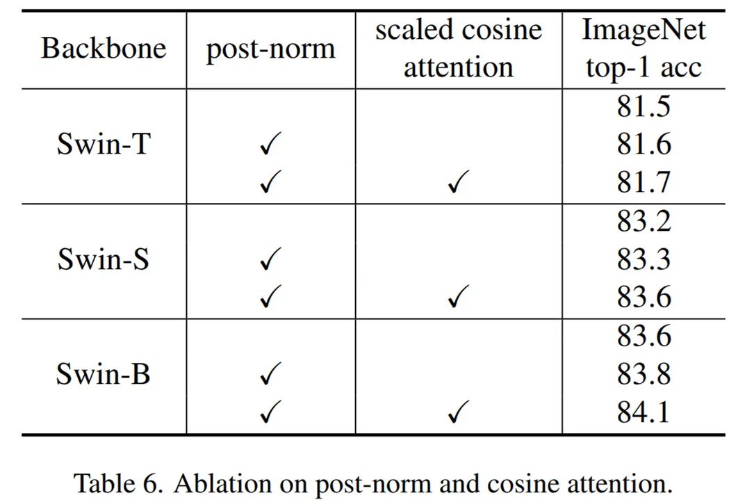 post-norm 和缩放余弦注意力的消融实验:下表 6 展示了 post-norm 和缩放余弦注意力方法应用于原始 Swin Transformer 方法的性能表现。可以看到,这两种方法都提高了 Swin-Tiny、Swin-Small 和 Swin-Base size 的准确率,整体提升分别为 +0.2%、+0.4% 和 +0.5%,表明它们对更大的模型更有益。