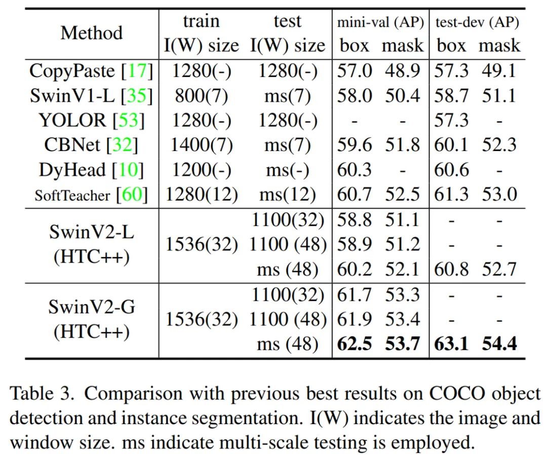 COCO 目标检测结果:表 3 将 SwinV2-G 模型与之前在 COCO 目标检测和实例分割任务上取得最佳性能模型进行了比较。SwinV2-G 在 COCO test-dev 上实现了 63.1/54.4 box/max AP,比 SoftTeacher(61.3/53.0) 提高了 + 1.8/1.4。这表明扩展视觉模型有利于目标检测任务中的密集视觉识别任务。