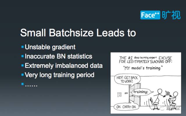 在COCO Detection比赛中,我们优先解决的是Batchsize的问题;回顾ImageNet Classification的工作,他们的Batchsize在训练过程中非常大,从起步开始就已经是128,最新的一些研究甚至达到了8000或者32K的水平,这使得人们可以在一个小时、乃至半个小时之内完成ImageNet的训练。