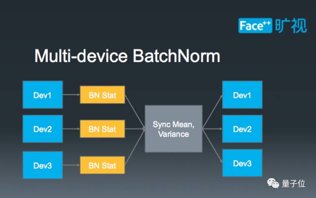 解决了BN统计不准确的问题。简单来讲,已有的BN统计方法局限于统计单张卡上的图片,做不到多张卡联合统计。由于物体检测本身的特性,单张卡上的图片数量达不到BN统计的要求,因此只能通过多卡联合统计来训练得到结果。为此,我们利用了NCCL(NVIDIA Collective Communications Library)代码库,实现了多卡BN。具体的算法流程可以参照上图,首先通过单卡自主统计BN的参数,再将参数发送到单张卡上进行合并,最后再把BN的结果同步到其他卡上,以进行下一步的训练。