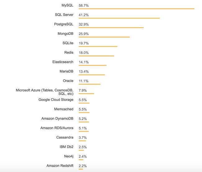 最流行的数据库是 MySQL,而不是 SQL Server。这并不令人惊讶,去年排在前两位的也是这两个数据库。今年,超过一半的受访者(58.7%)正在使用 MySQL。