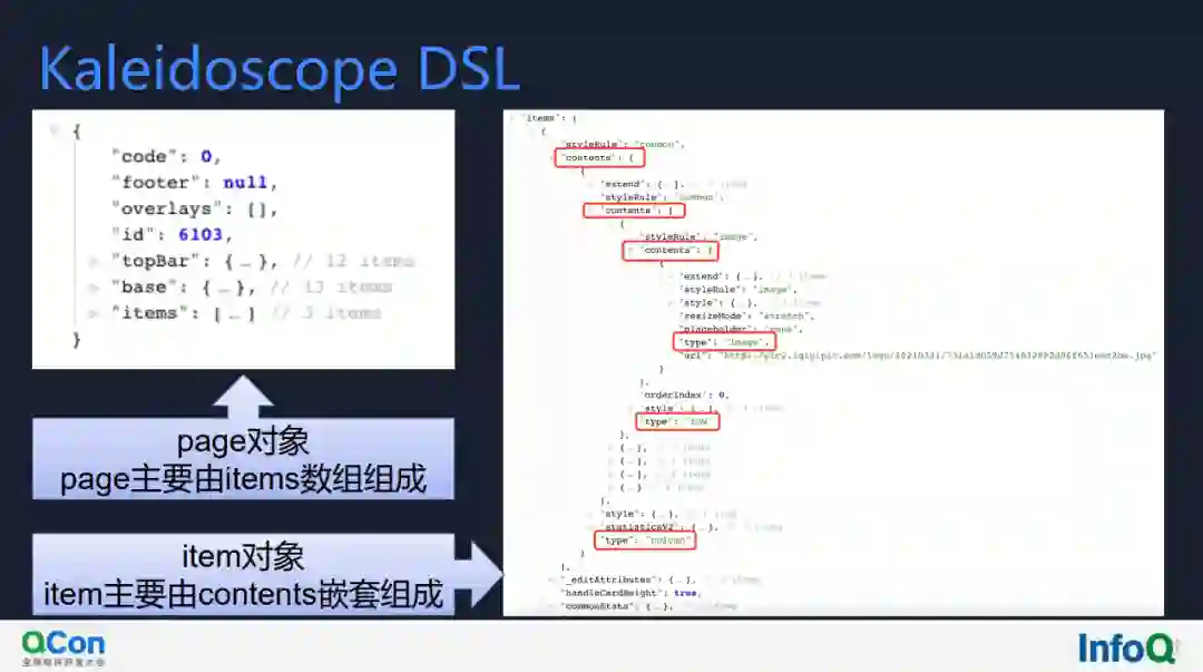 图中左侧为一个 JSON 结构,其中 Page 对象最重要的属性为 Items 数组,单个 Item 由多个 contents 嵌套组成(图中右侧),再加上容器型 Element 中的 content,即可实现千变万化的布局。