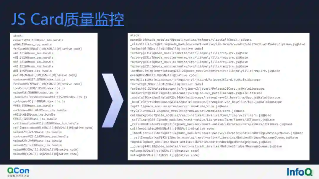 端上捕获投递的原始 JS 崩溃栈(图中左侧),没有详细信息。还原后(图中右侧)路径文件名详细,便于问题诊断。