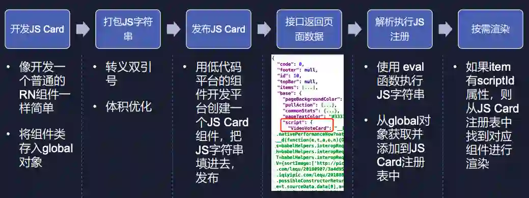 参考 HTML 中通过夹带标签编写 JS 实现动态效果,为提高业务适应性,我们在 JSON 中也添加了 JS 脚本。针对无法用 JSON 描述的非通用需求场景,我们允许以 Card(列表项)为粒度直接用 RN 开发,打包成 JS 字符串之后和其他 JSON 数据一起下发,动态加载运行。Card 为前文中的 Item 被渲染后的带界面的占有一定高度的实体。