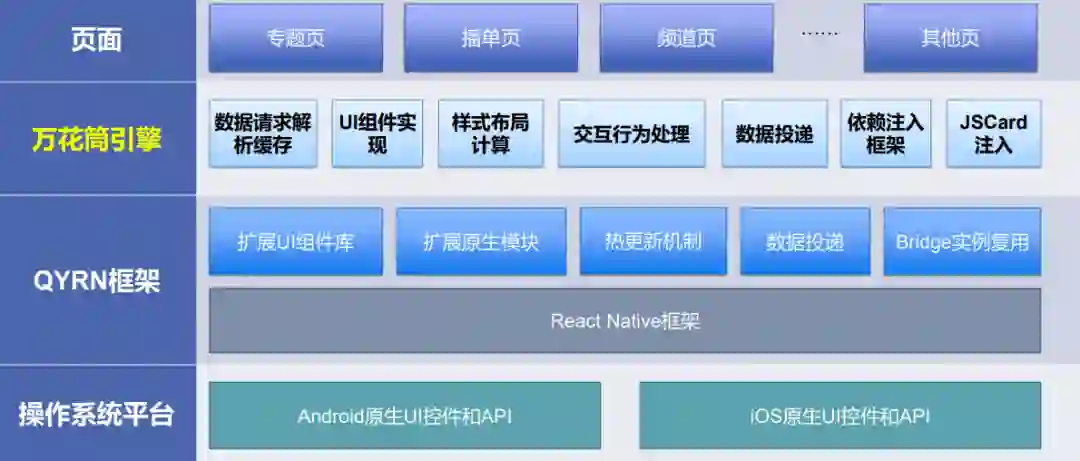 前端架构中 Kaleidoscope 引擎处于下面架构图的第二层,主要负责数据的下载、缓存和解析,依赖于 QYRN 框架。QYRN 框架是爱奇艺以 RN 官方框架为基础封装的框架,它丰富了官方框架的组件库,扩展了 UI 组件和原生模块,实现了热更新机制、数据投递和 Bridge 实例复用。
