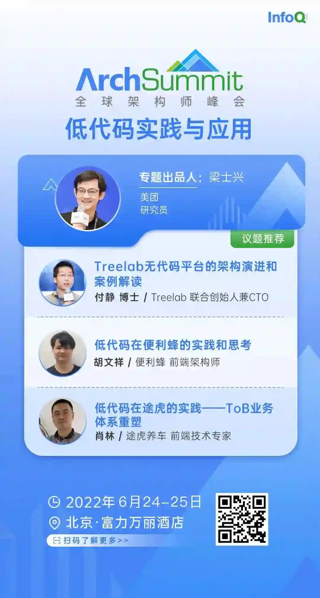 今年 6 月 ArchSummit 架构师峰会北京站上,也策划了低代码平台设计专题,邀请了便利蜂、途虎养车、Treelab 等企业的专家来分享各自实践,感兴趣的可以点击底部阅读原文查看议题内容。