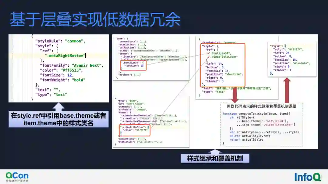 为了减少页面中的冗余信息,爱奇艺基于 CSS 的层叠样式表提出了层叠的概念,支持了信息复用和组合,针对样式数据提出了 Style 和 Theme,针对 pingback 数据提出了 Statistics 和 CommonStats。可在 Style 中引用 Theme,在 Statistics 引用 CommonStats,且支持按先后顺序覆盖合成。