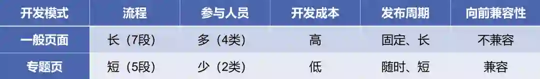 专题页开发流程与一般页面在流程、人员、成本上、发布周期、向前兼容性上均存在差异。专题页开发只有提出需求、视觉设计、搭建页面、自测验证、投放上线五步。其中,需求是由编辑提出的。