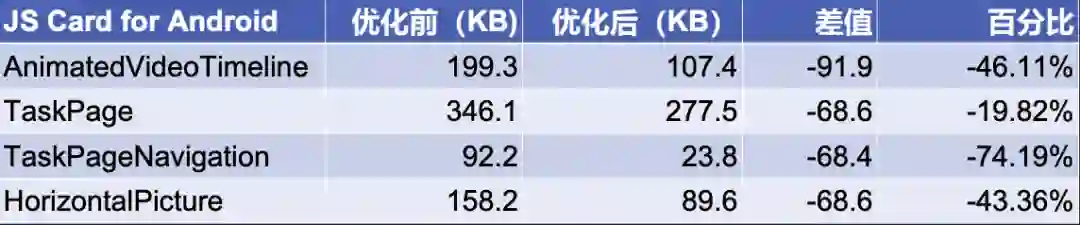 JS Card 方面,我们在业务分包后再次分包,用自研的 JS Card 专用打包工具进行打包,将 JS Card 中万花筒引擎自身已经包含的依赖库在打包的时候剔除。经过层层分包爱奇艺已上线的 JS Card 如下图所示,体积明显下降。