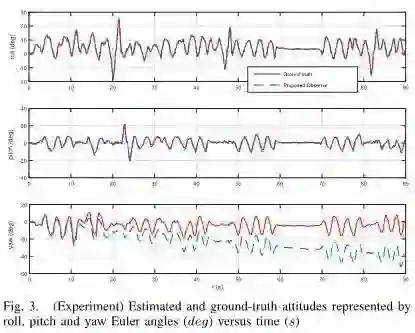 图3.估计值与真实值在翻滚角、俯仰角、偏航角上的对比